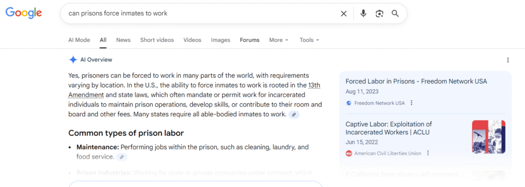 Another AI overview quote: “In the United States, it is legal to force convicted prisoners to work due to a specific exception in the Thirteenth Amendment of the U.S. Constitution. The Thirteenth Amendment, ratified in 1865, abolished slavery and involuntary servitude ‘except as a punishment for crime whereof the party shall have been duly convicted’.”